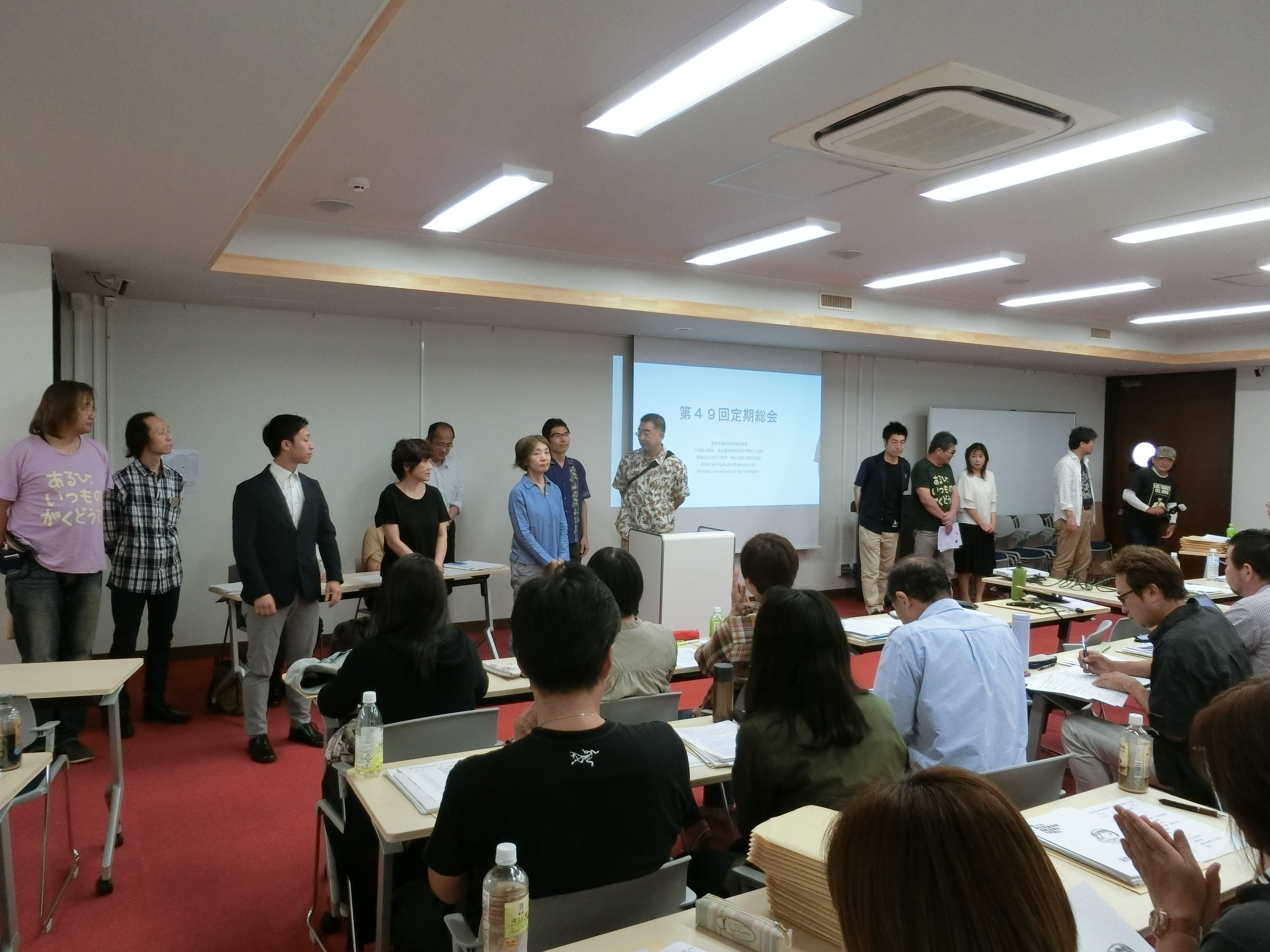 5月27日(日)に、国会議員や県会議員ら23名の来賓を迎えて開催された愛知学童保育連絡協議会(県連協)総会では、江坂会長らが続投する新役員体制を確認しました。