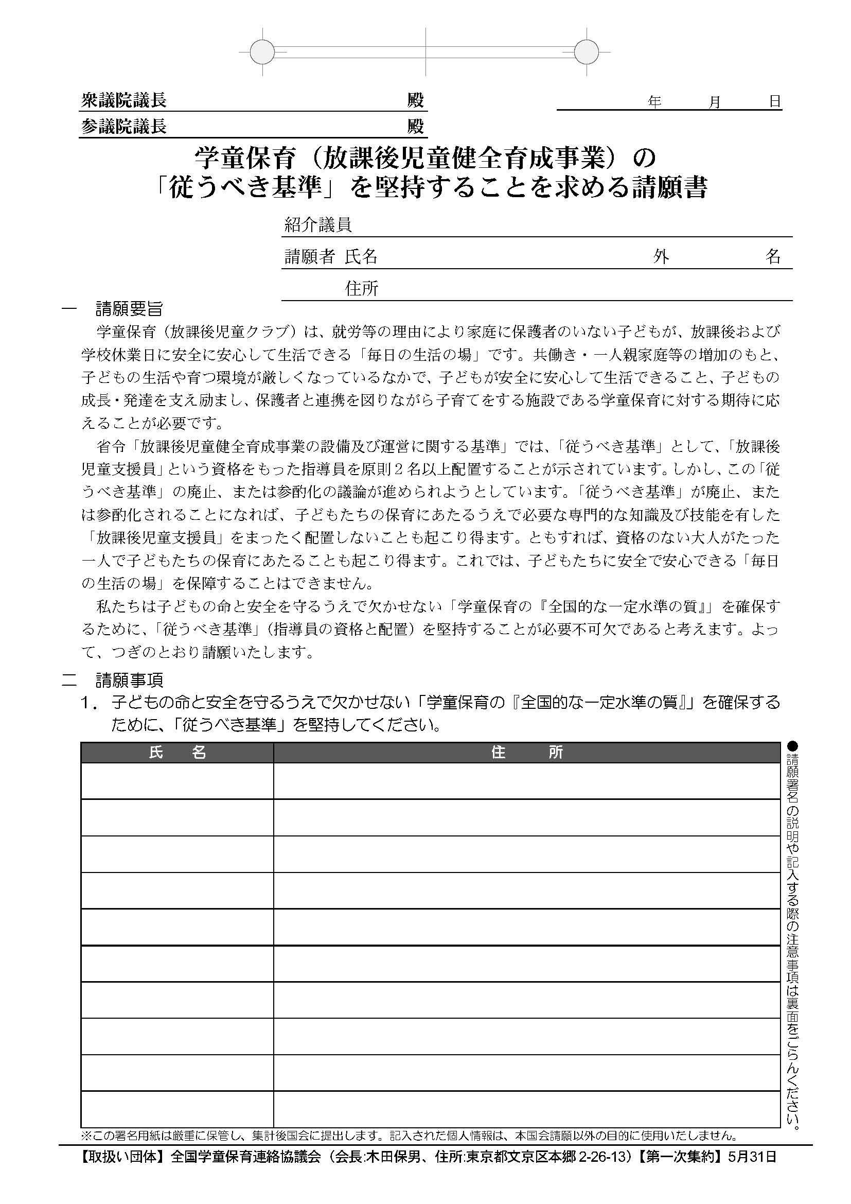 全国学童保育連絡協議会は6 月6 日、学童保育の指導員配置基準を緩和しようとする国の動きに対し、「学童保育の『従うべき基準』を堅持することを求める請願書」(184,269 筆→6 月30 日では200,300筆)を、衆参両議院に提出しました。